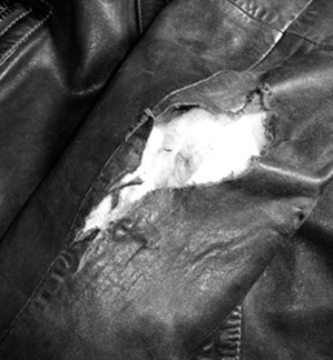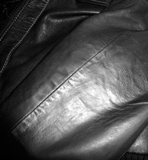 Black leather jacket has wide tear horizontally. Kyrou Tailoring was able to salvage the jacket